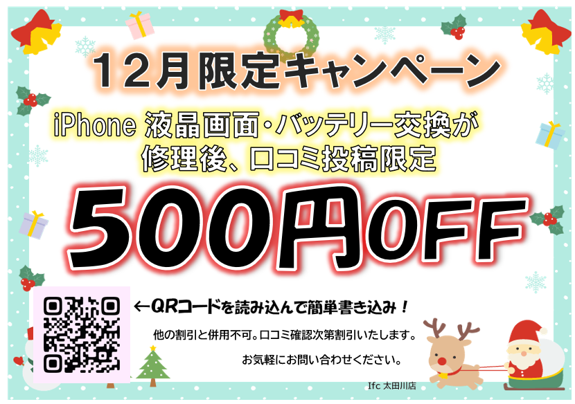 ★12月限定キャンペーン★口コミ投稿者限定★パネル・バッテリー修理500円OFF‼