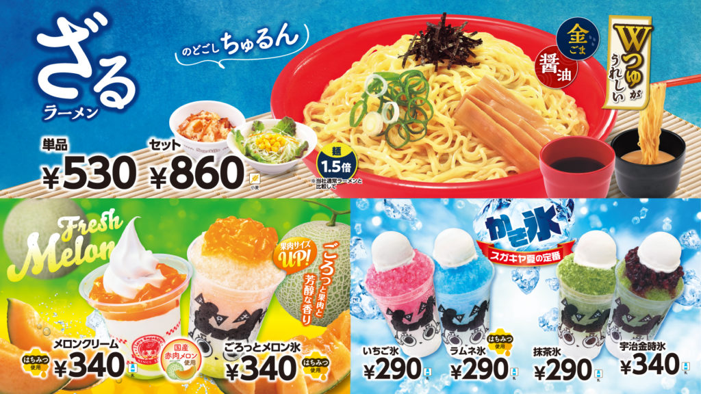 華やかな鰹だしがふわりと香る、素材の風味を活かした「醤油つゆ」、フレッシュなねりごまの甘みと、やさしく香るごま油を使用した後味すっきりコクのある金ごま仕立ての「ごまつゆ」のWつゆがうれしい通常のラーメンの1.5倍量の麺をつけて食べる春夏定番の冷し麺です。