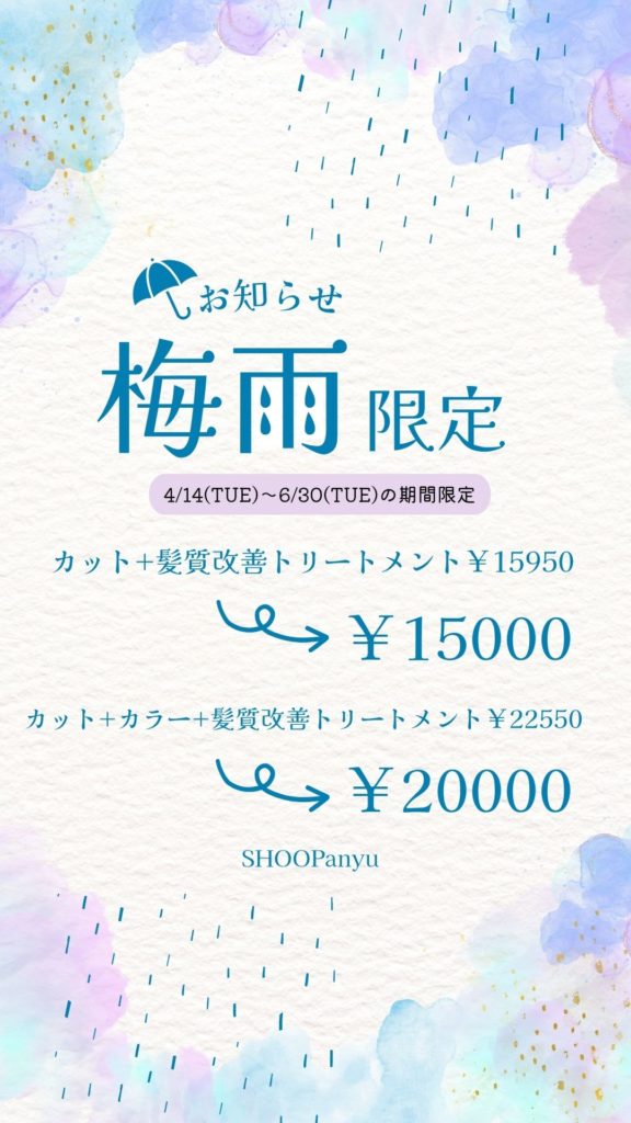 6/30(火)までの期間限定で大人気の髪質改善トリートメントが組み合わされたメニューを特別料金でご案内させていただきます!ホットペッパービューティーのネット予約限定ですがお電話でもご案内可能ですので「ラスパのホームページを見た」とおっしゃっていただけたらスムーズにご案内させていただきます☆ぜひ髪の広がりが気になってくる季節の前にぜひ一度お試しください☆