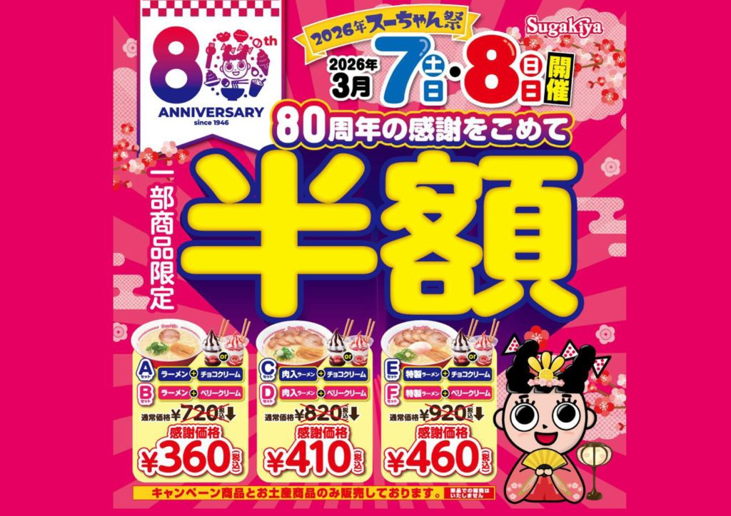 3月7日・8日の2日間、スガキヤでは6種のセットメニューを通常価格の「半額」で提供いたします。